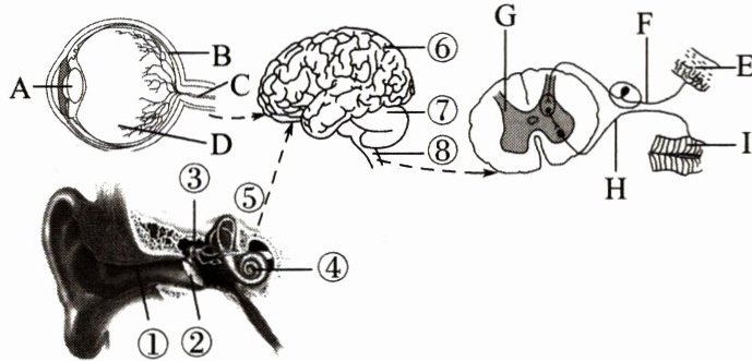 (2)小米在逃生过程中不小心伤到了膝盖,校医在帮她清理伤口时,一碰到伤口她立即______(填“缩回”或“伸直”)腿,神经冲动先经过一系列途径传到G,再沿着G→______(用字母和箭头表示)的途径传导。痛觉形成的位置在______(填序号)的躯体感觉中枢。