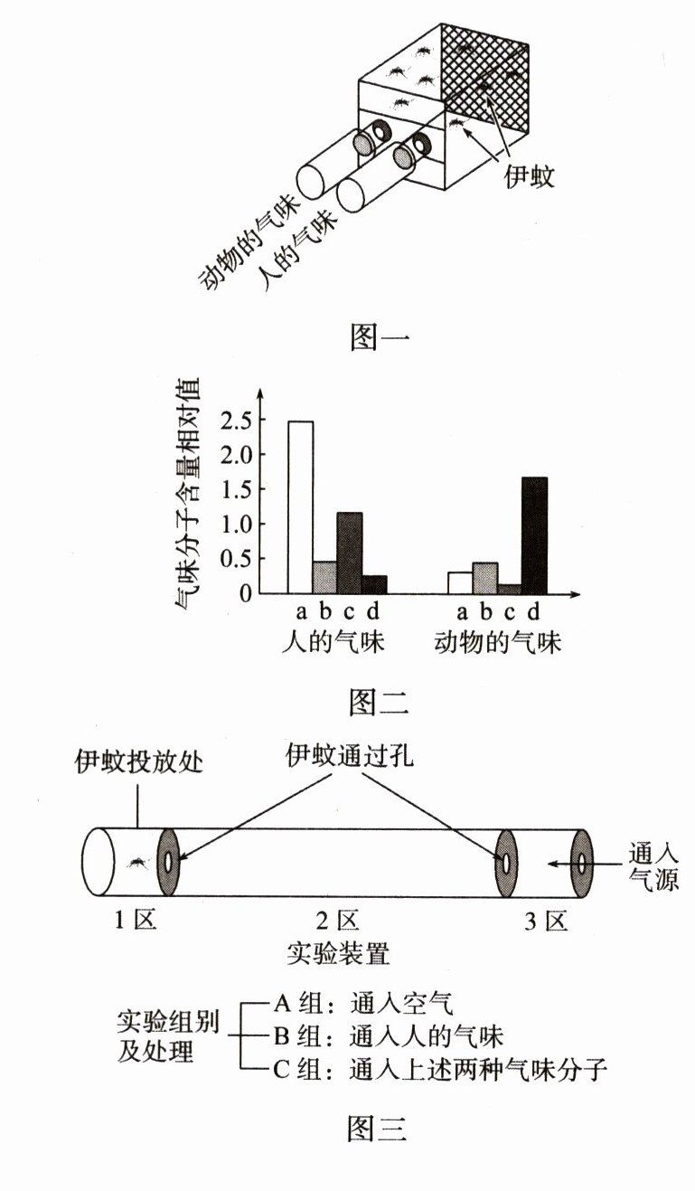 (3)科研人员测定出人和动物中的主要气味分子有 a、b、c、d,其含量如图二所示。据图分析,人与吸引伊蚊有关的气味是____两种气味分子,依据是____。