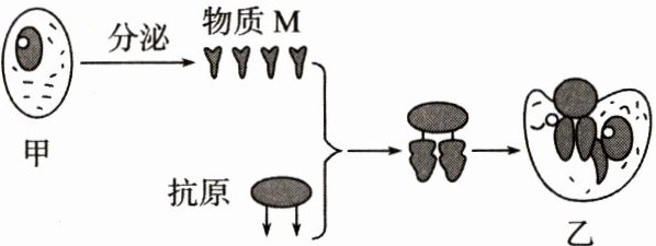 D 解析:题图中甲细胞能产生物质M,结合所学知识可知,甲是淋巴细胞,能识别抗原并产生抗体。物质M是由淋巴细胞产生的,能与抗原特异性结合,所以物质M表示抗体。抗体是一类特殊的蛋白质,能够特异性地识别和结合抗原,发挥免疫作用。该免疫过程中,淋巴细胞识别抗原后产生抗体,抗体与抗原的结合是特异性的。