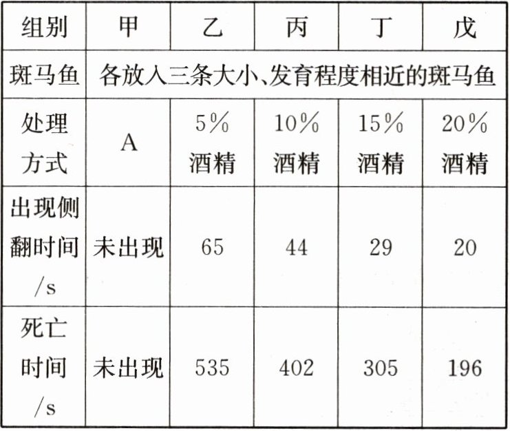 7. 为探究酒精对生物生命活动的影响,某校生物学兴趣小组利用斑马鱼进行了如下实验,观察实验现象并记录,如表所示。