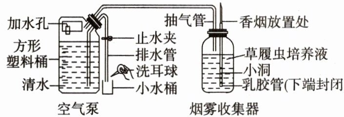 第三步:在收集器香烟放置处插入一支点燃的香烟,打开止水夹,用洗耳球将排水管中的空气吸出,使清水通过排水管持续流出,观察到收集器中的乳胶管上有气泡产生。