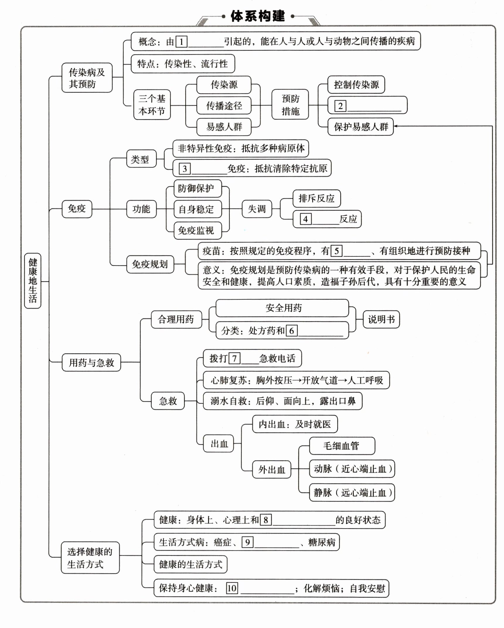①病原体 ②切断传播途径 ③特异性 ④过敏 ⑤计划 ⑥非处方药 ⑦120 ⑧社会适应方面 ⑨心血管病 ⑩转移注意力