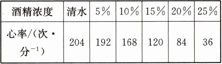 12. 玻璃鱼是一种身体近乎透明的小鱼,某生物学小组利用玻璃鱼探究酒精对心率的影响,实验数据如表所示。下列说法正确的是( )