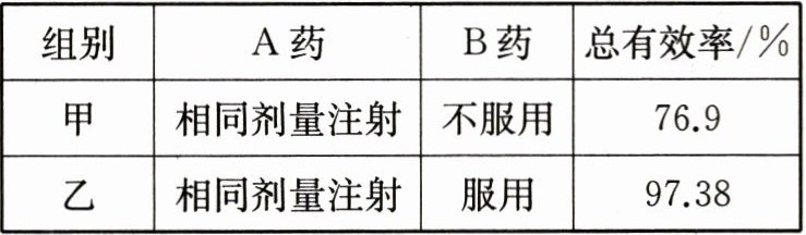 10. 水痘是由水痘—带状疱疹病毒引起的儿童常见急性呼吸道传染病,临床常规治疗以A药为主。为了研究B药的辅助治疗是否有效,研究人员选取若干名水痘儿童患者,将其平均分成两组,治疗1周后的效果如表所示。下列分析错误的是( )