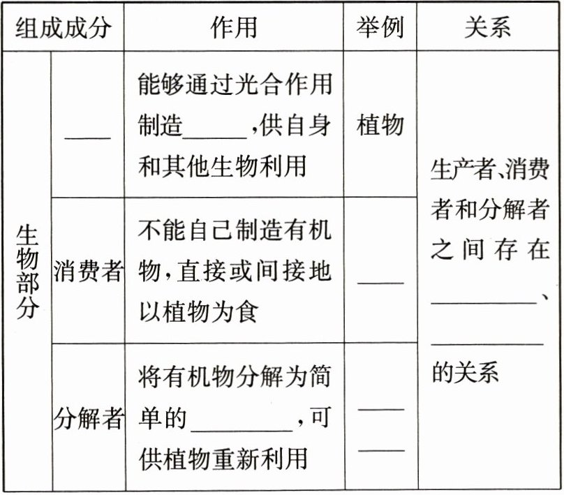 | 生物部分 | 生产者 | 能够通过光合作用制造____,供自身和其他生物利用 | 植物 | 生产者、消费者和分解者之间存在____、____的关系 |