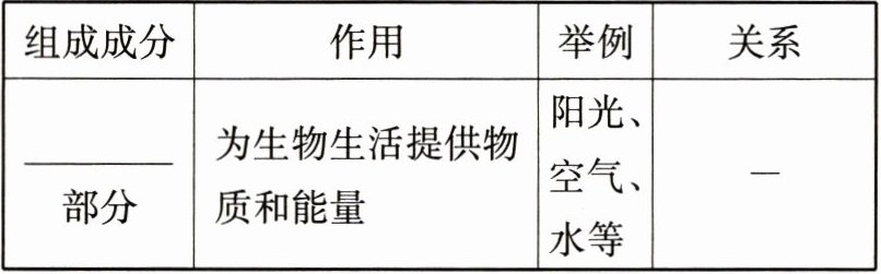 | ____部分 | 为生物生活提供物质和能量 | 阳光、空气、水等 | — |