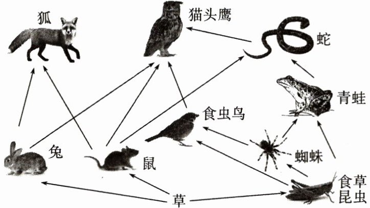 (1)草→鼠→蛇→猫头鹰(或草→鼠→猫头鹰;草→食草昆虫→食虫鸟→猫头鹰;草→食草昆虫→蜘蛛→食虫鸟→猫头鹰;草→食草昆虫→蜘蛛→青蛙→蛇→猫头鹰;草→食草昆虫→青蛙→蛇→猫头鹰;草→鼠→狐;草→兔→狐;草→兔→猫头鹰)。