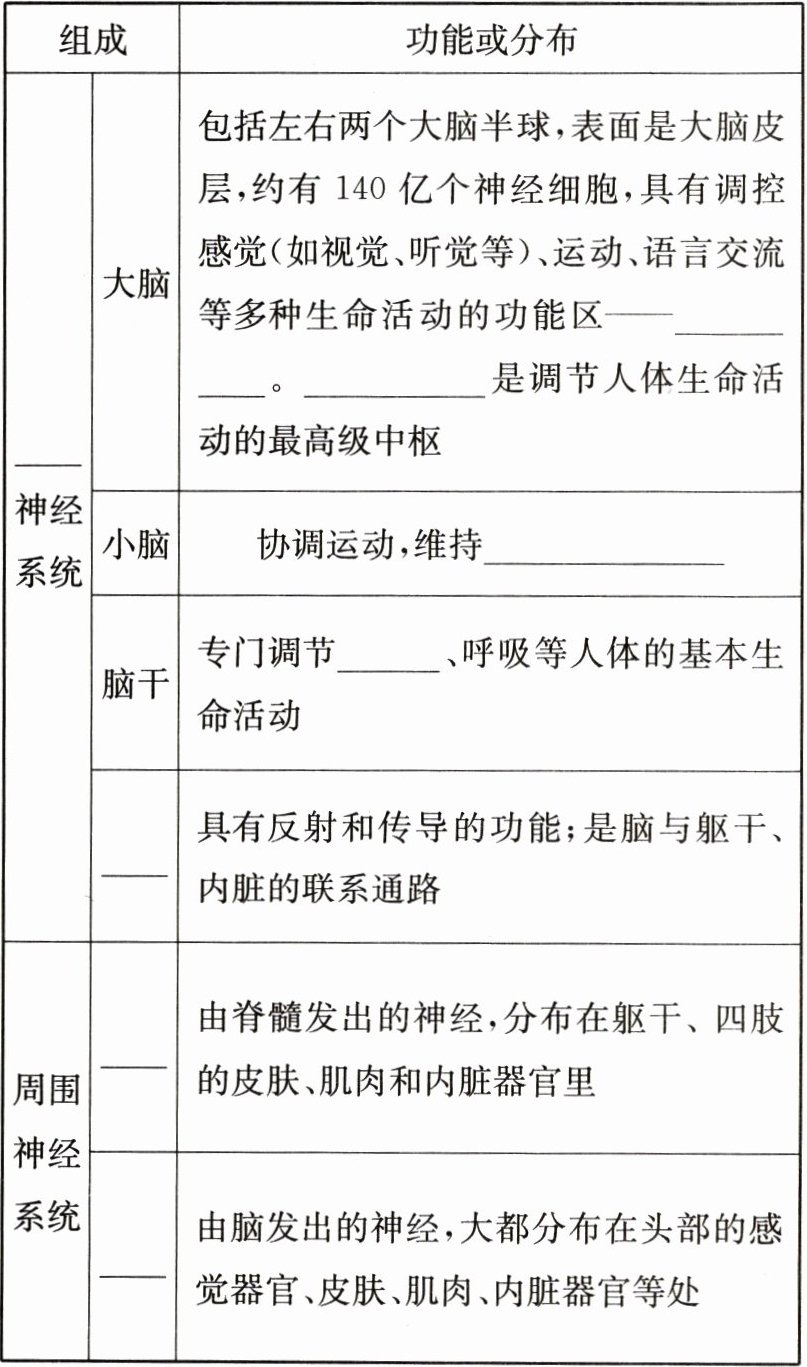 请仔细阅读课本 P12~P14“神经系统的组成”内容,在阅读的过程中,圈画出关键词句。阅读完成后独立思考并试着完成下面的表格。