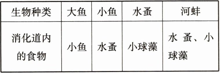 7. 小尔对池塘里几种动物消化道内的食物进行了分析,结果见下表。下列描述正确的是 ( )