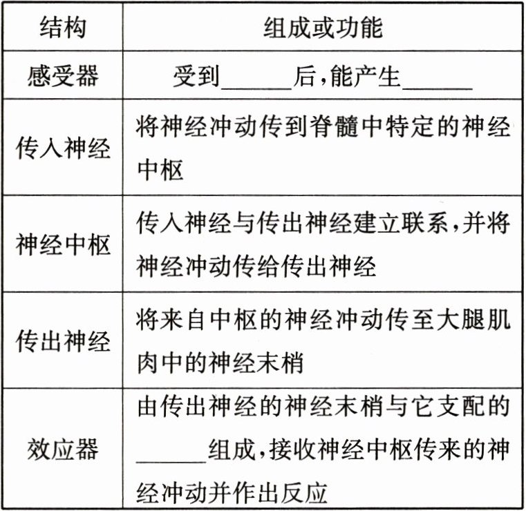 3. 完成膝跳反射的基本过程中反射弧各部分的组成或功能表格