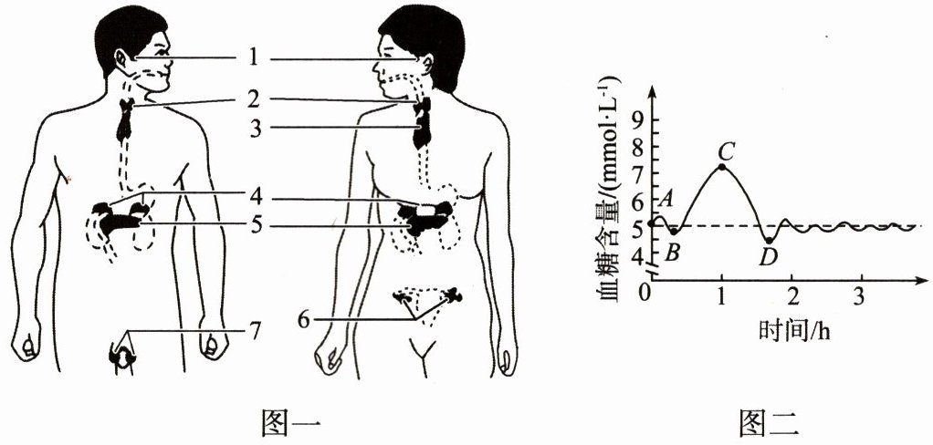 34. 图一是人体主要的内分泌腺,图二是正常人的血糖含量变化曲线图,请观察和辨析图中各数字所代表的结构,并回答下列问题。