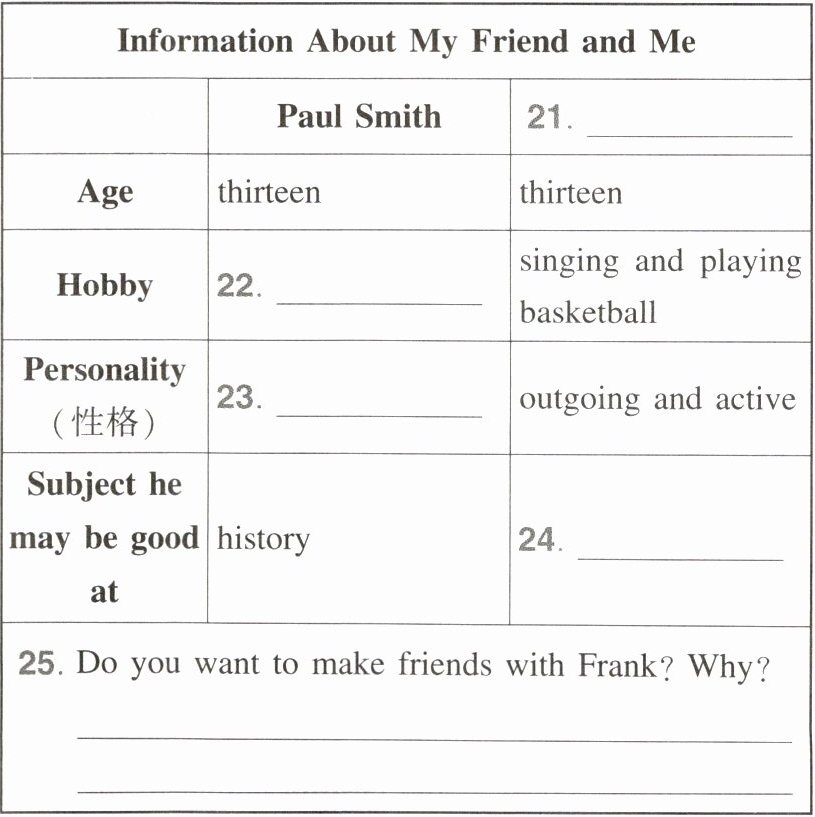 21. Scott Miller 22. singing and reading 23. shy and quiet 24. maths and science 25. Yes, I do. Because I also like playing basketball, and I want to play with him.