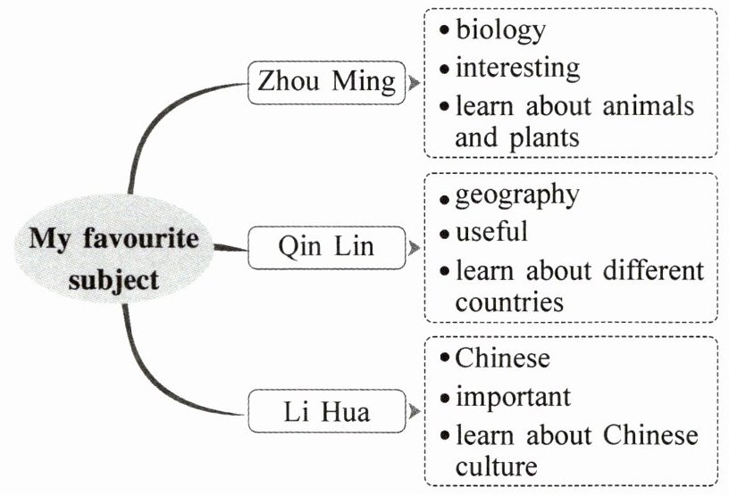 Zhou Ming's favourite subject is biology because he thinks it's interesting. He can learn about many kinds of animals and plants in class. Qin Lin's favourite subject is geography because it's useful to him. He can learn about different countries in class. He often travels to different places in his free time. My favourite subject is Chinese because it's very important. I can learn about Chinese culture in class. I'm good at Chinese and I want to be a writer in the future.