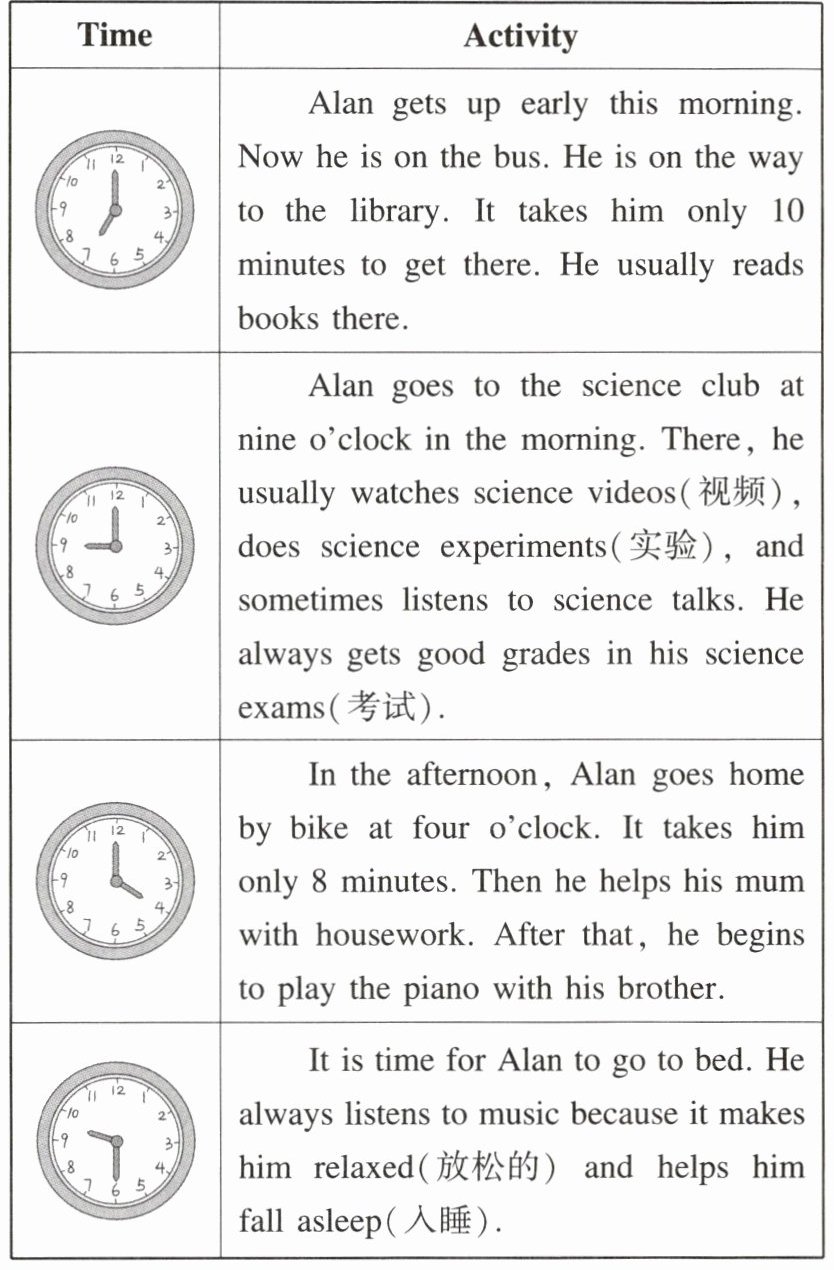 Alan is a middle school student from the UK. It is Saturday today, and he doesn't go to school. Let's look at what he does.