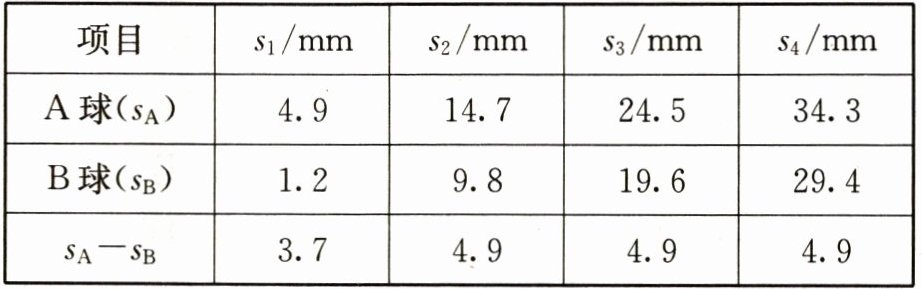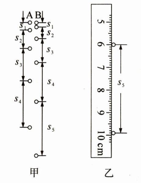 (填“A”或“B”)球。(2) 用刻度尺分别测得照片上$A$、$B$两球相邻位置之间的各段距离,$A$、$B$两球相对应的$s_{1}$、$s_{2}$、$s_{3}$、$s_{4}$的测量结果如表所示。测量照片上$B$球相邻位置之间的距离$s_{5}$时,刻度尺的示数如图乙所示,则$s_{5}=$
