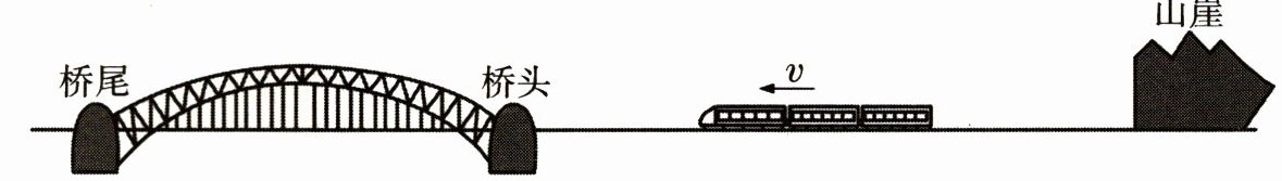 6. 如图所示,长度为150m的火车在笔直的轨道上匀速行驶,在从山崖驶向大桥的过程中,火车在车头距离桥头200m处鸣笛,鸣笛5s后,火车头到达桥头,此时司机听到来自山崖的回声,听到回声30s后,车尾驶过桥尾.(声音在空气中的传播速度为340m/s)