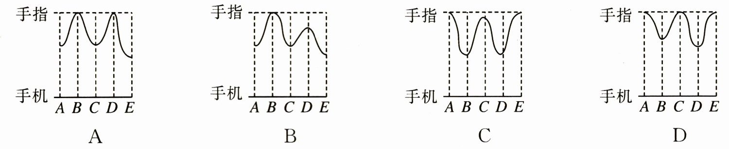 6. [物理观念]放大手指局部,表面是凹凸不平的.超声波指纹识别系统发出超声波遇到手指上A、B、C、D、E五个位置,测得回波信号的时间分别为0.30ms、0.36ms、0.30ms、0.36ms、0.26ms(1ms=0.001s).根据时间求出手指上各位置与手机平面间的距离,就可以绘出指纹的大致形状,则下图中与该处指纹的大致形状相符的是(