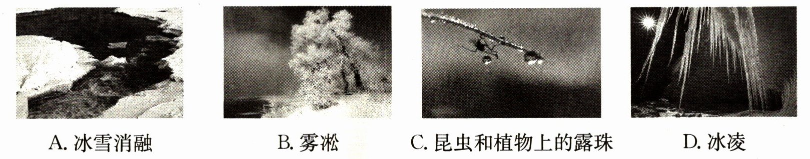 4. [物理观念]寒假期间,家在南方的小东一家去哈尔滨旅游,体验到了北方冬季生活的乐趣. 对以下北方冬季景象中包含的物态变化判断