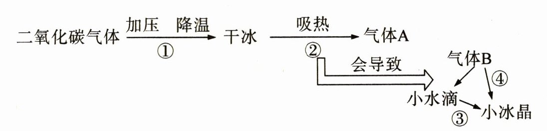 $二氧化碳气体\xrightarrow[①]{加压\ 降温}干冰\xrightarrow[②]{吸热}气体A\xrightarrow[会导致]{}\ 小水滴\xrightarrow[③]{}\ 小冰晶\xleftarrow[④]{气体B}$
