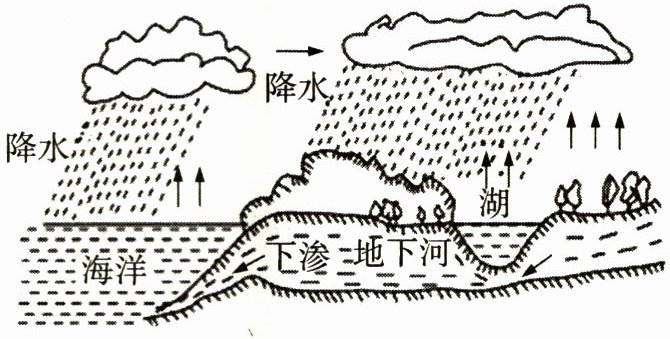 3. 如图是大自然中水循环现象的示意图. 江、河、湖、海以及大地表层中的水不断蒸发变成水蒸气,当水蒸气升入高空时,温度降低变成小水滴或变成小冰晶,就形成了云.