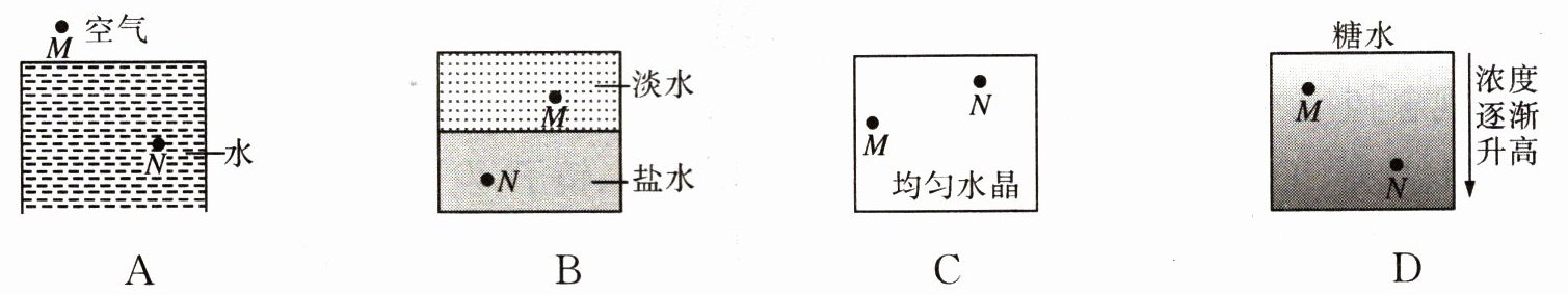 ▶典例2:下列四种情形中,光能沿直线从 $ M $ 点传播到 $ N $ 点的是(