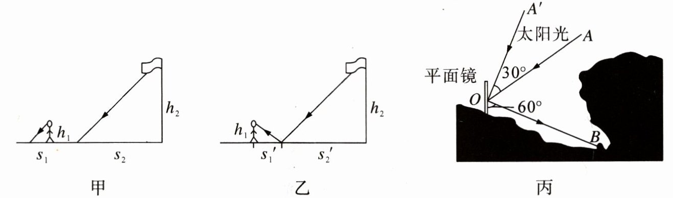 方法②:如图乙所示,选一人作为观测者,在他与旗杆之间的地面上平放一面小镜子,固定小镜子的位置,观测者看着镜子来回调整自己的位置,使自己能够通过镜子看到旗杆顶端,测量出图中标识的物理量,利用数学原理算出旗杆的高度.从物理的角度看,利用的是光的