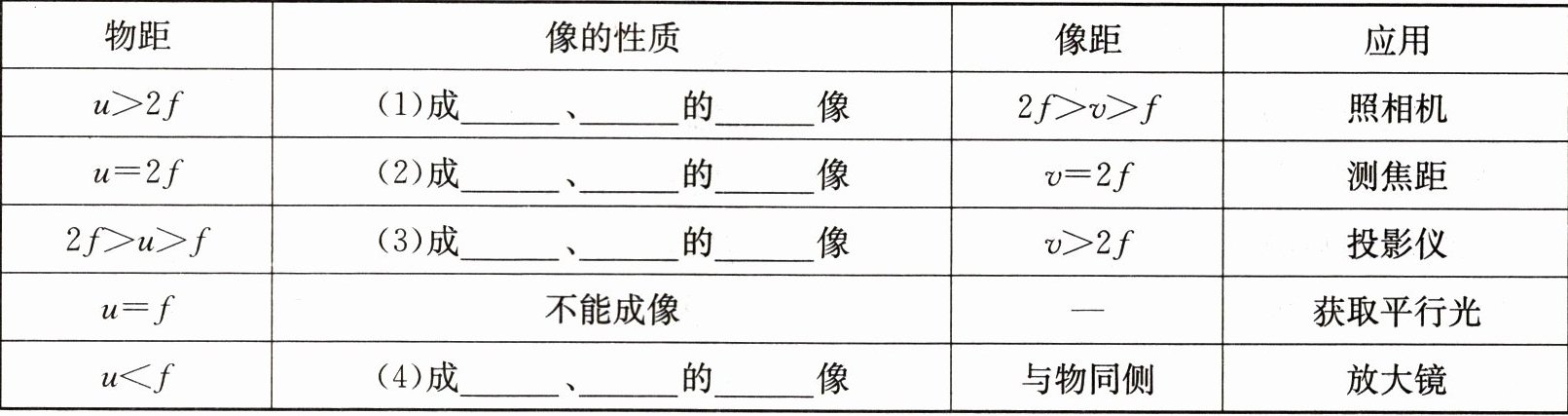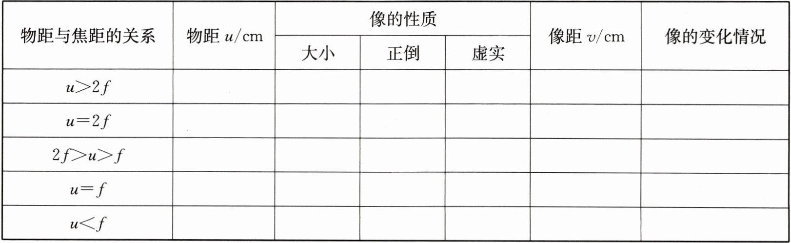 (1) 如图所示,把发光物移到距离凸透镜大于2倍焦距的位置,调整光屏到凸透镜的距离,直到光屏上出现发光物清晰的像,观察像的大小和正倒,测出物距$u$和像距$v$;改变物距,重复以上操作,并将实验数据填入表格中。