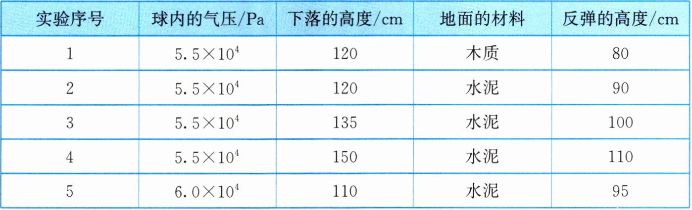 (2)小明又将同一篮球依次充入不同气压值的气体,从不同高度自由下落到木质或水泥地面,用刻度尺测出球反弹的高度,进行多次实验。记录的部分数据如表格所示: