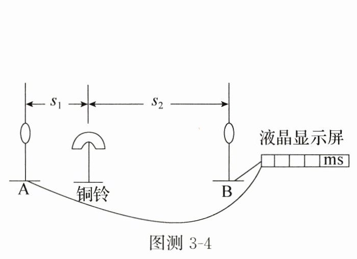 16. 声速测量仪的实验装置图如图测 3 - 4 所示,其中 A、B 为声信号采集器,敲打铜铃时,声音被 A、B 接收,液晶显示屏显示 A、B 接收到信号的时间差,单位为毫秒(ms)(1 ms = 10⁻³ s),回答下列问题: