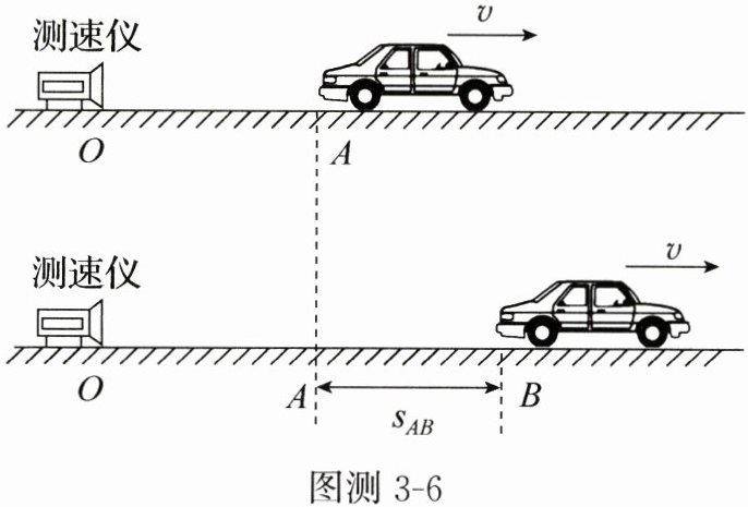 19. 超声波测速仪发出超声波脉冲信号,遇到汽车发生反射,通过分析发出和接收到信号的时间差,可计算出汽车的速度。如图测 3 - 6 所示,在限速为 80 km/h 的直线路段,交警架设了超声波测速仪测汽车速度。当行驶的汽车距离测速仪$ s_{OA} = 62 m $时,测速仪向汽车发出超声波,超声波“追上”汽车时,汽车刚好运动到 B 点。测速仪从发出到接收反射回来的超声波所用的时间是 0.4 s。已知超声波传播的速度为 340 m/s。