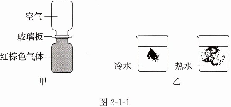 实验 1:如图 2 - 1 - 1 甲所示,下面的玻璃瓶内装有红棕色的气体,上面的玻璃瓶内是空气,两个玻璃瓶瓶口相对。抽掉瓶口之间的玻璃板,经过一段时间后发现上面的玻璃瓶内气体的颜色变深,下面的玻璃瓶内气体的颜色变浅。