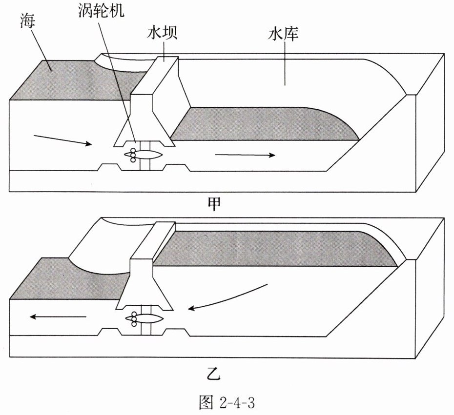 12. 潮汐能是一种有待开发的新能源,双向型潮汐电站示意图如图 2-4-3 所示,在海湾建一拦水坝,使海湾与大海隔开构成水库,在坝上安装水轮发电机组,利用潮汐造成的坝内、外水位差,引导高水位的海水通过水轮发电机发电。根据以上材料介绍和所学知识回答:(对应目标:812405)
