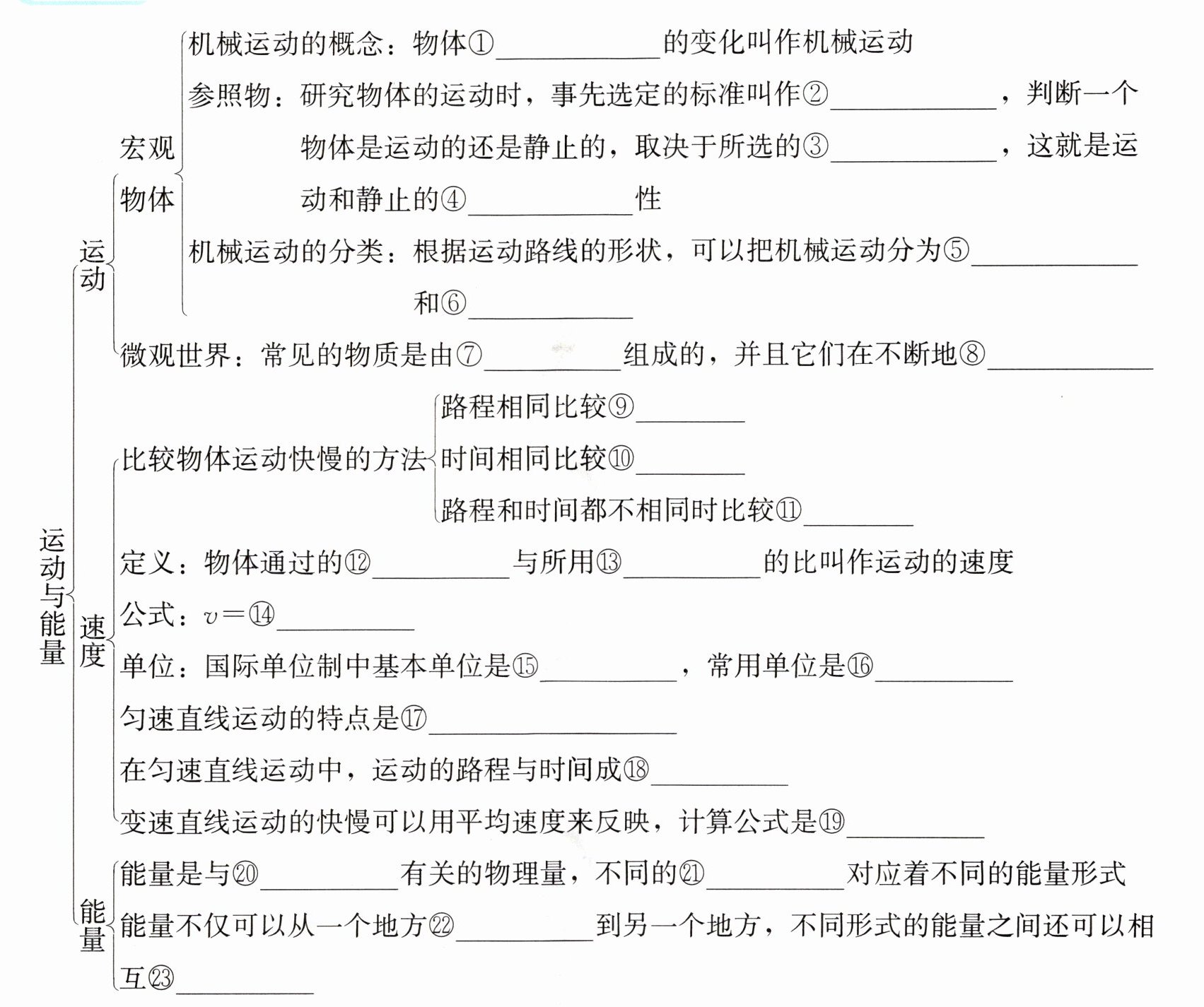 ①位置;②参照物;③参照物;④相对;⑤直线运动;⑥曲线运动;⑦分子;⑧运动;⑨时间;⑩路程;⑪路程与时间的比值;⑫路程;⑬时间;⑭s/t;⑮m/s;⑯km/h;⑰速度不变;⑱正比;⑲v=s/t;⑳物体运动;㉑运动形式;㉒转移;㉓转化