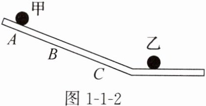 8. 为了探究“运动与静止的鸡蛋在撞击时哪个更容易破”,小明让甲鸡蛋分别从斜面上的 A、B、C 三处由静止释放,撞击静止在水平面上的另一枚相同的乙鸡蛋,如图 1 - 1 - 2 所示。实验结果:第一次两枚鸡蛋都破;第二次甲鸡蛋完好、乙鸡蛋破;第三次两枚鸡蛋都不破。得到的结论或接下来的步骤是(