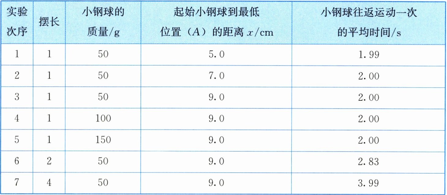(填实验次序)三组数据可知:小钢球往返运动一次的时间与起始小钢球到最低位置($A$)的距离$x$无关。(2)由表中第3、4、5次实验数据可知:小钢球往返运动一次的时间与