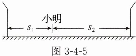 10. 如图3-4-5所示,有一山谷宽1700m,两旁都是垂直的山崖,小明在山谷里某处大喊一声,他听到了一连串的回声,前两次回声间隔4s。求小明到两旁山崖的距离。(取空气中的声速为340m/s)(对应目标:813401,813405)
