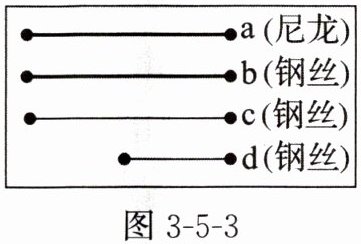 (1)小新同学在琵琶演奏中发现,拨动不同琴弦发出的音调与弦线的长度、粗细、材料和松紧程度有关。于是她利用弦音计(如图3-5-3所示)做研究,弦音计上有四根固定在“音箱”上的琴弦,每根弦线的松紧程度都相同。她选用的琴弦长度、粗细、材料在图中均已标出。若她选择a、b两弦线做实验,则研究的目的是探究音调与弦线