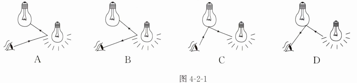 2. 黑暗的房间里有两盏电灯,只有一盏灯点亮,但人能看到未点亮的灯泡。图4-2-1中,对于“看到未点亮的灯泡”所画的光路图,正确的是(