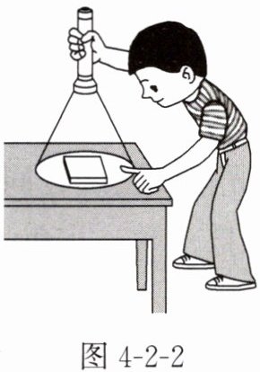 4. 晚上,在桌面上铺一张白纸,把一个小平面镜平放在纸上,让手电筒的光正对着平面镜照射,如图4-2-2所示,则从侧面看去(