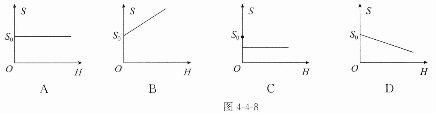 11. 如图4-4-7所示,在烧杯正中心上方固定一手电筒光源,光线向下投射到空烧杯底部形成一个圆形光斑(图中虚线所示),此时圆形光斑的面积大小为 $S_0$。现在往烧杯中匀速注水,随着烧杯内液面高度 $H$ 的增加,圆形光斑面积 $S$ 变化情况描述正确的大致图像是图4-4-8中的(