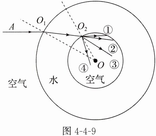 。(2)天宫课堂中的水球中央有一个球形气泡,两个球心都在 $O$ 点,结构如图4-4-9所示。一束光 $AO_1$ 从空气射入水球,其中 $O_1$ 与 $O$、$O_2$ 与 $O$ 的连线均为法线,则光从水球进入气泡球时,折射光线可能为