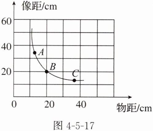 5. 在做“探究凸透镜成像规律”的实验时,某实验小组所描绘的图线如图 4 - 5 - 17 所示。图线中 A、B、C 三点分别与蜡烛在光具座上移动过程中的三个位置相对应。则下列说法正确的是(