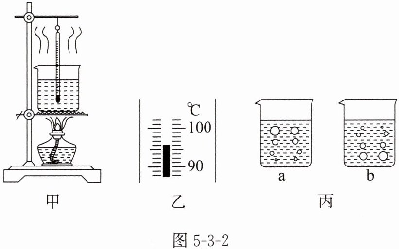 (2)在水温升高到90℃后,每隔1min记录一次温度计的示数,直到水沸腾并持续几分钟后停止读数,图5-3-2乙为第3min时温度计的示数,请你帮他们读出示数并填入表格中。