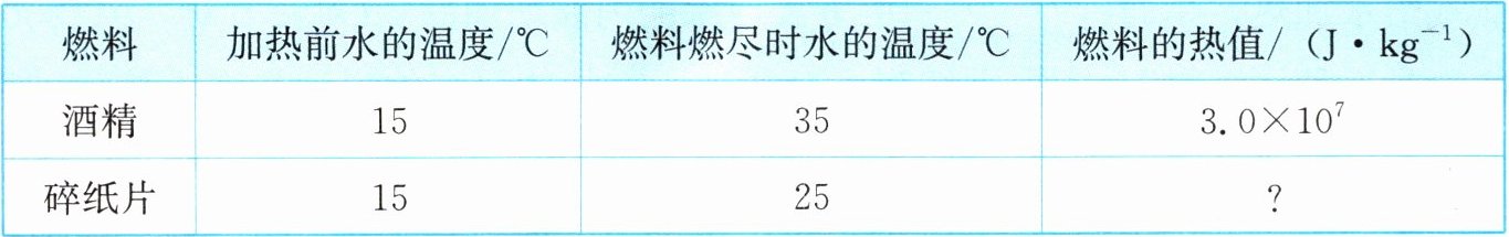 (选填“酒精”或“碎纸片”)放出的热量更多。(4)实验数据记录如下表: