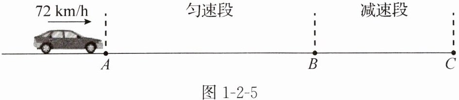 11. 某油电混合动力汽车沿平直公路以72 km/h的速度匀速行驶,从A处到B处用时1 h,此过程中汽油燃烧释放热量的30%用于驱动汽车匀速行驶,汽车行驶过程中所受阻力恒为1 000 N。从B处开始,司机关闭发动机,汽车滑行至C处停止,如图1-2-5所示。假设汽油完全燃烧,且热值近似取q = 5×10⁷ J/kg。求在上述行驶过程中:(对应目标:911206)