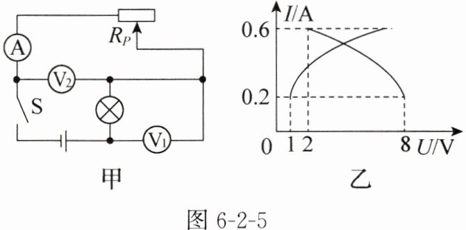 8. 如图 6 - 2 - 5 甲所示,调节滑动变阻器的滑片从最右端滑至灯泡正常发光的位置,电流表的示数与两电压表的示数的关系如图 6 - 2 - 5 乙所示,则下列说法正确的是(