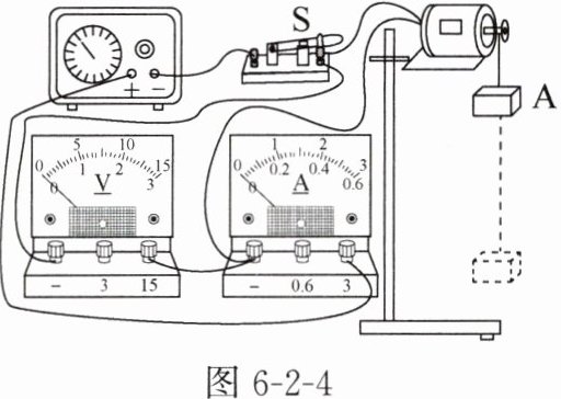 7. (多选)如图 6 - 2 - 4 所示,利用电动机提升物体研究影响电功大小的因素,装置中物体 A 的质量为 400 g,以 0.5 m/s 的速度匀速被提升(g 取 10 N/kg)。下列说法正确的是(