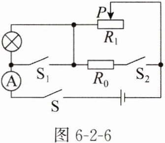 10. 如图 6 - 2 - 6 所示,电源电压恒为 6 V, $ R_0 $ 的阻值为 30 Ω,滑动变阻器 $ R_1 $ 的规格为“20 Ω 1 A”,电流表的测量范围为 0~3 A,小灯泡上标有“2.5 V 1.25 W”字样。将 S 闭合, $ S_1 $、 $ S_2 $ 均断开,调节滑动变阻器的滑片 P 的位置,使小灯泡正常发光。求:(对应目标:916201)