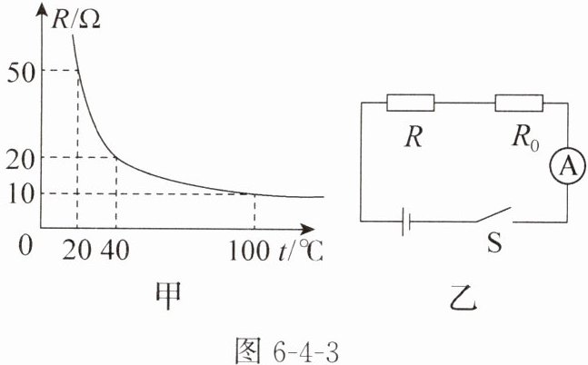 5. 半导体材料的导电能力介于导体和绝缘体之间,其电阻受温度影响较大。某种半导体材料的电阻随温度变化的关系图像如图6-4-3甲所示。根据这种半导体材料电阻的特性,小明和他的同学设计的电路如图6-4-3乙所示,可以测定某一空间的温度,使用的器材有半导体电阻尺、电源、电流表(0~0.6 A)、开关、定值电阻R₀(10 Ω)、导线若干。 (对应目标:916401)