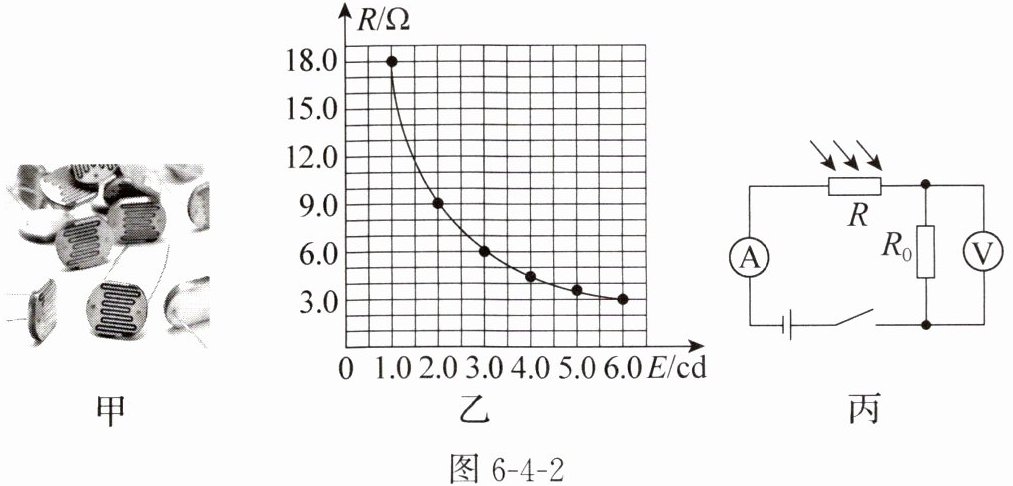 乙所示。把它接在如图6−4−2丙所示的电路中,其中R是光敏电阻,R。是定值电阻。(对应